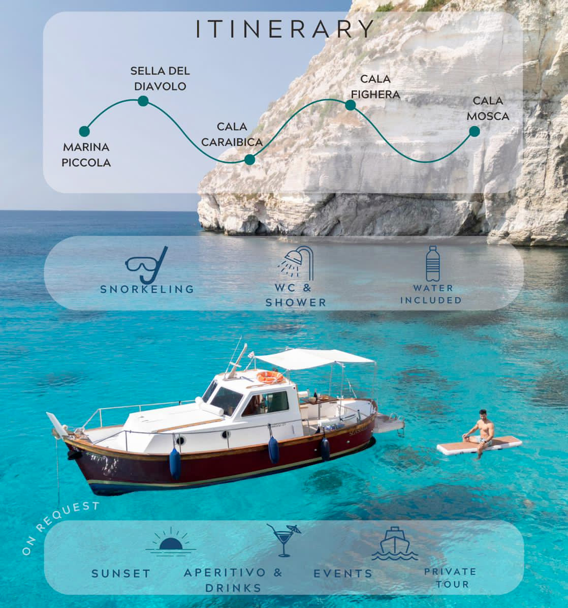 Nota: gli orari delle partenze vengono concordati al momento della prenotazione e possono variare in base alle condizioni meteo-marine.